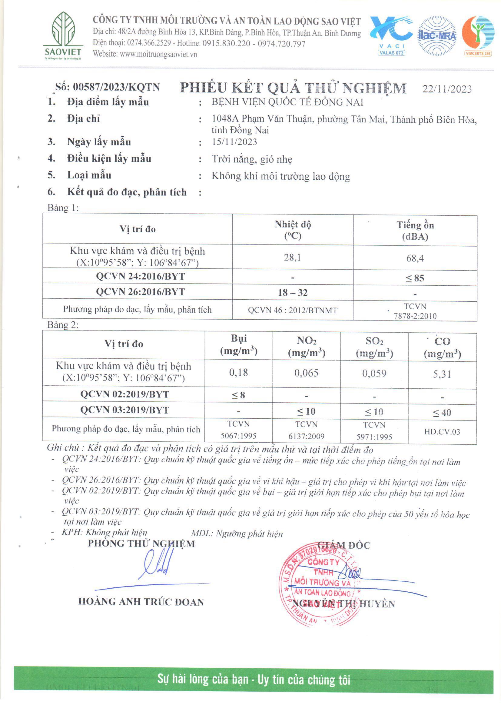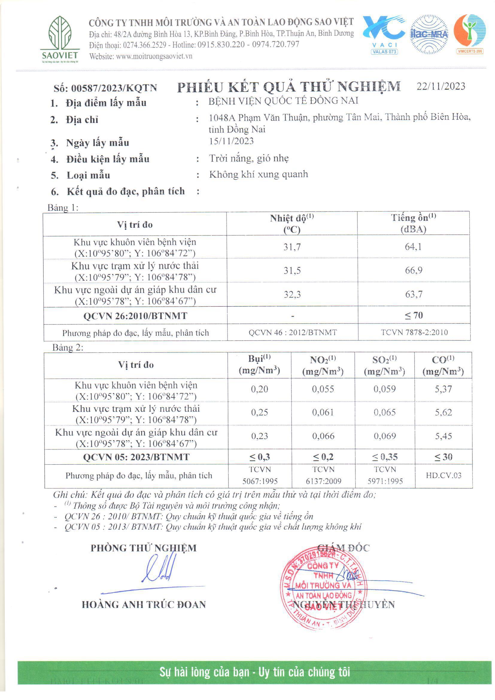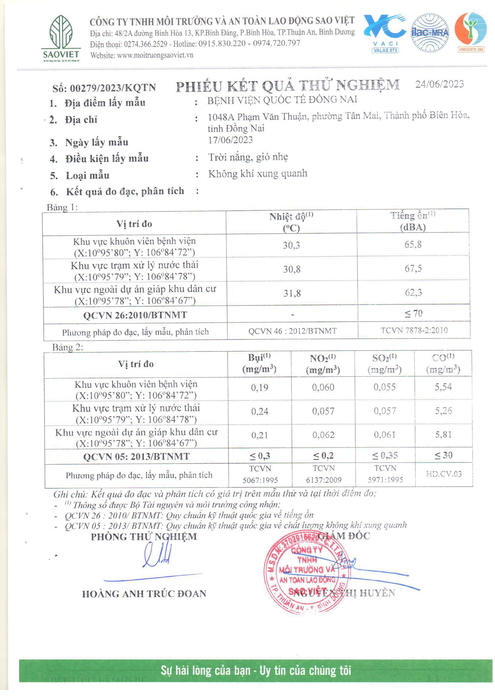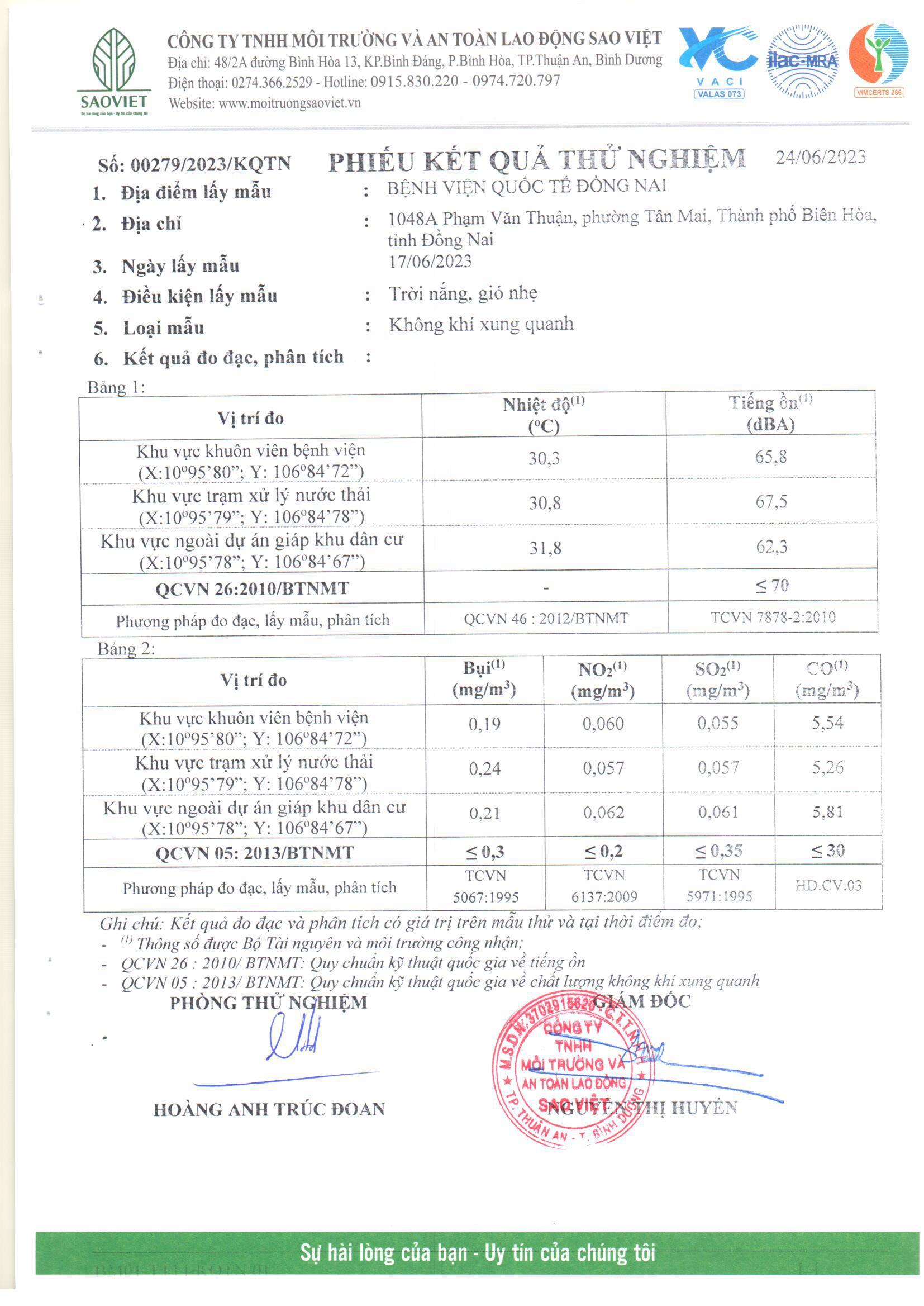 Kết quả quan trắc học 2023 Bệnh viện Hoàn Mỹ Đồng Nai