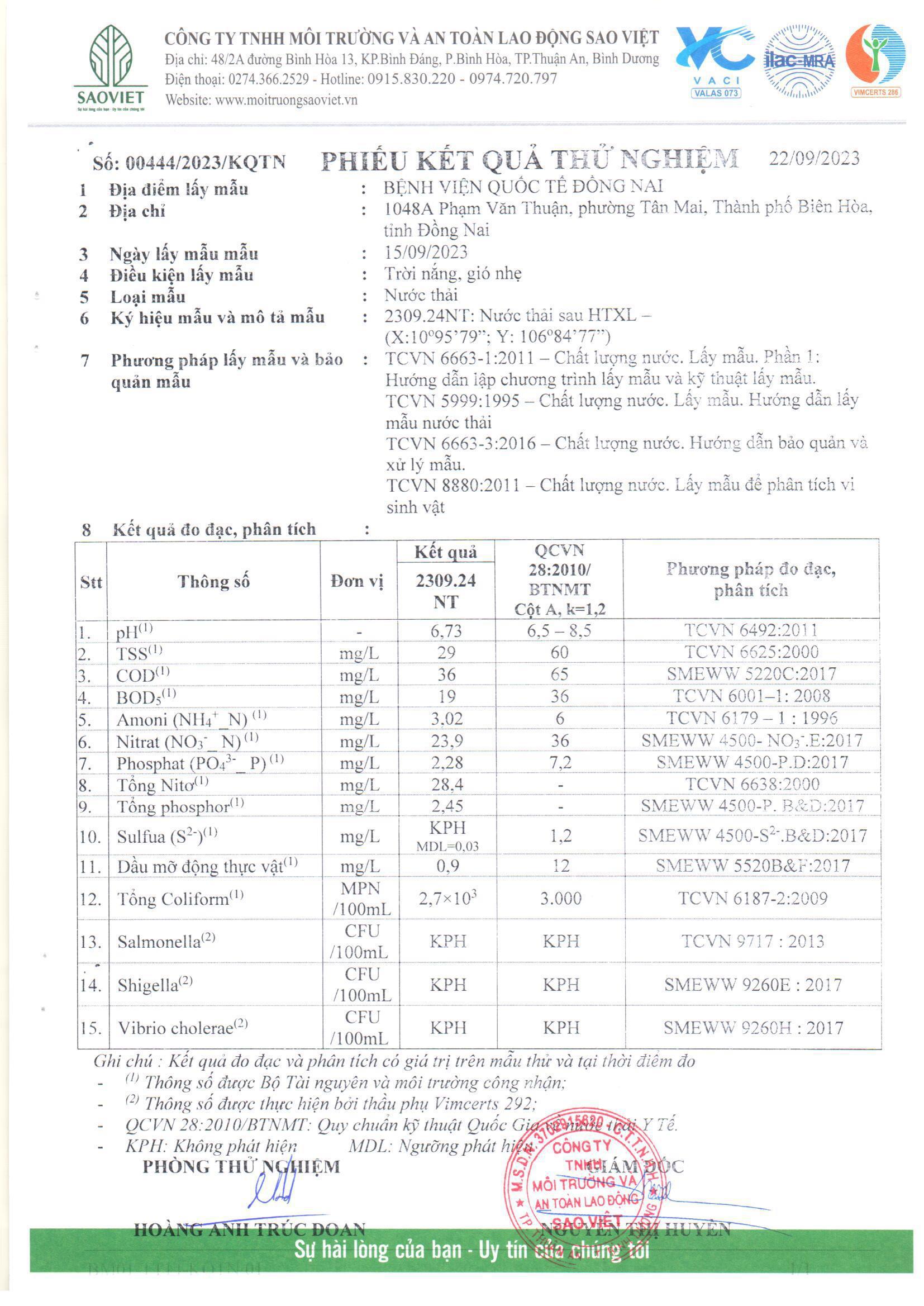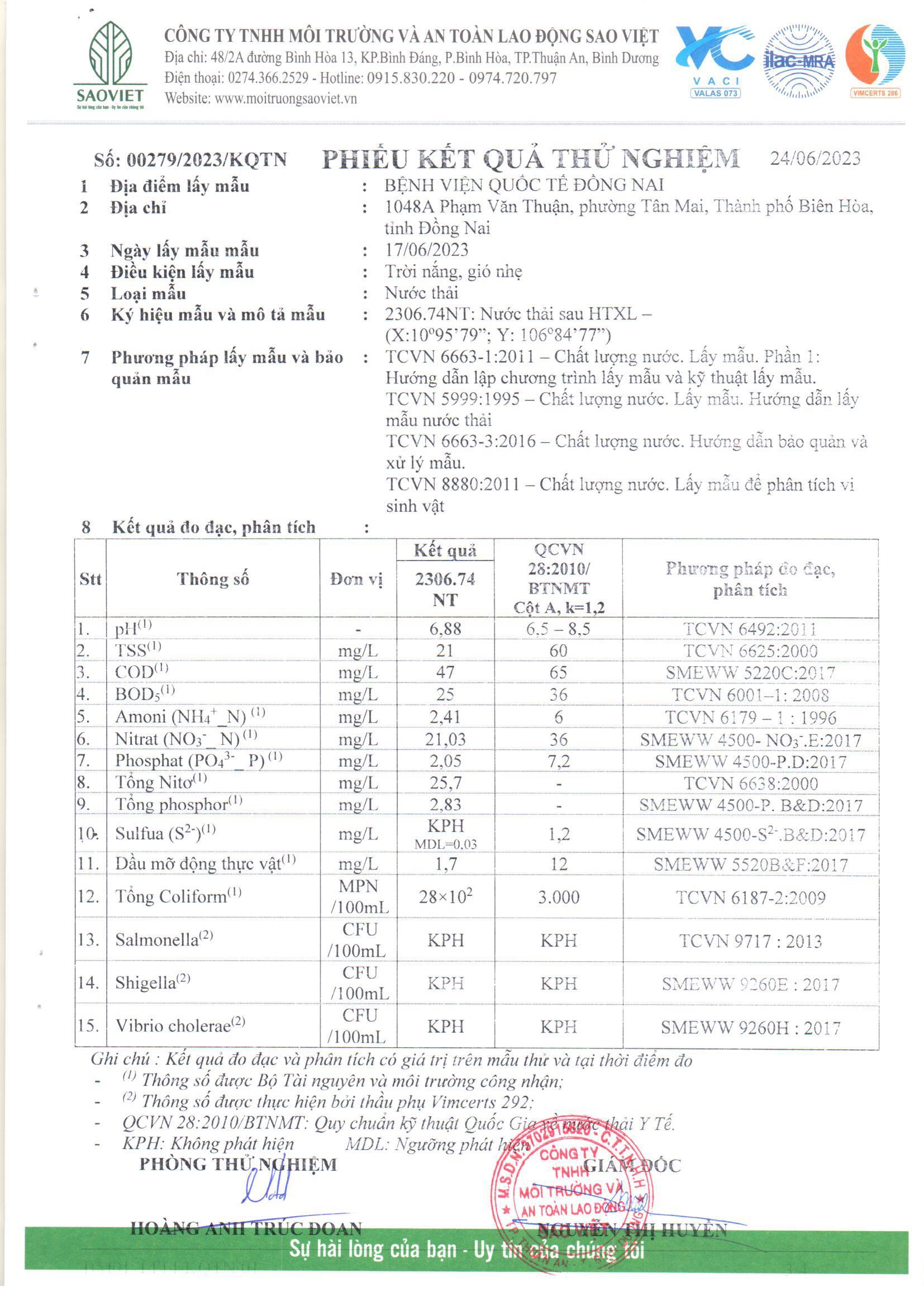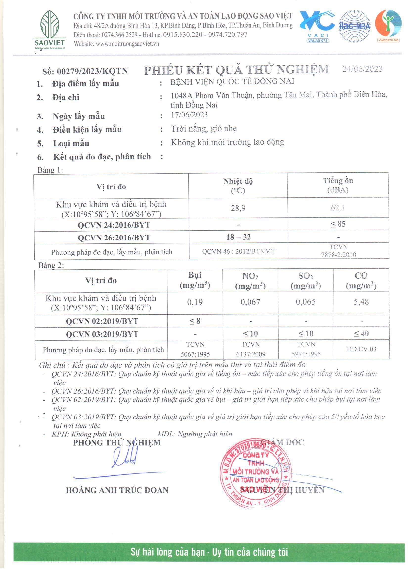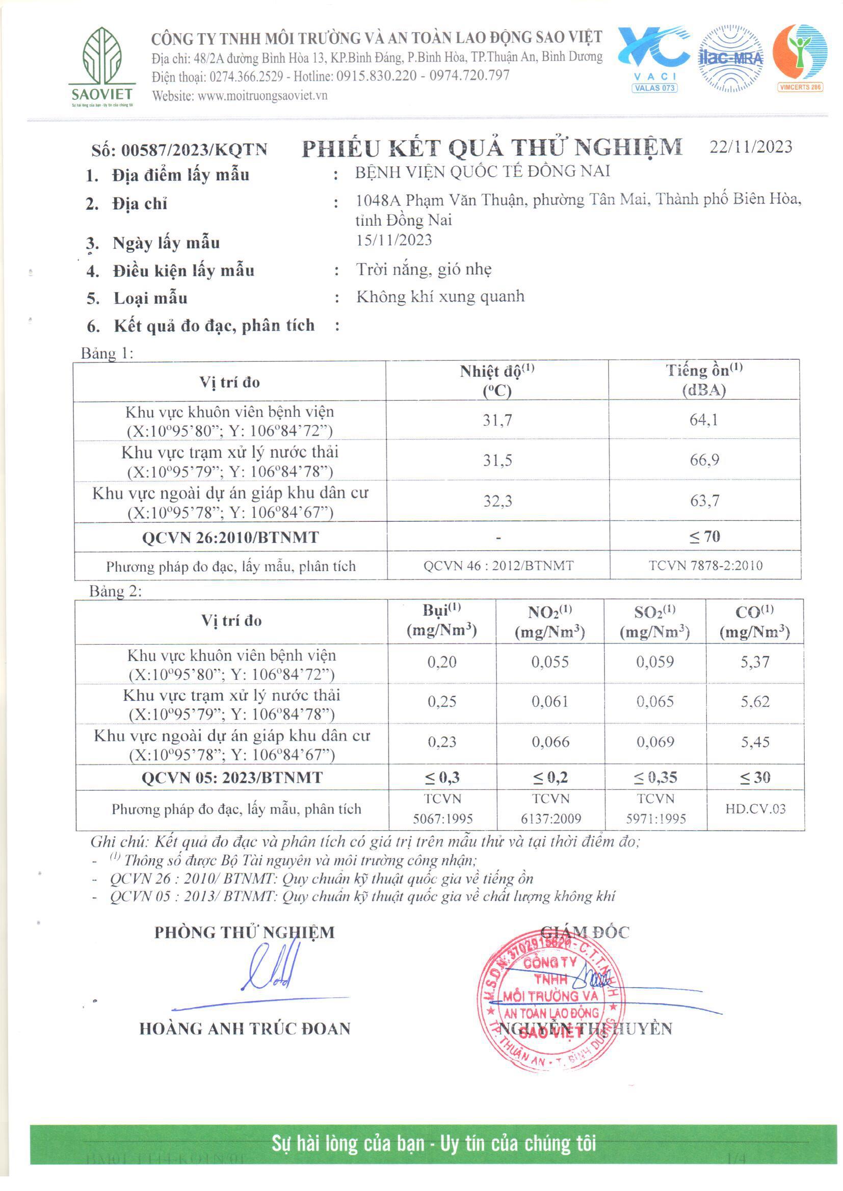 Kết quả quan trắc học 2023 Bệnh viện Hoàn Mỹ Đồng Nai