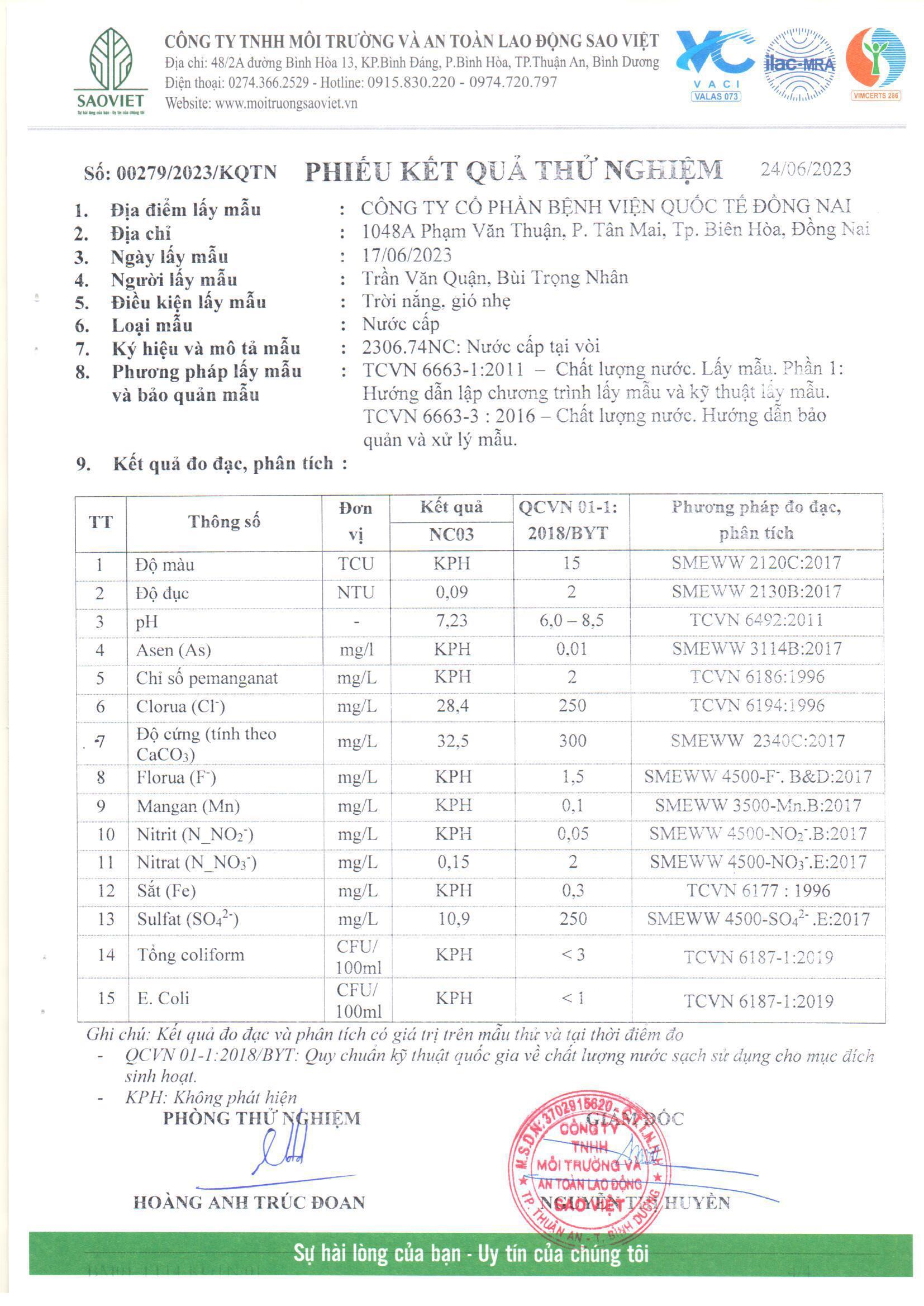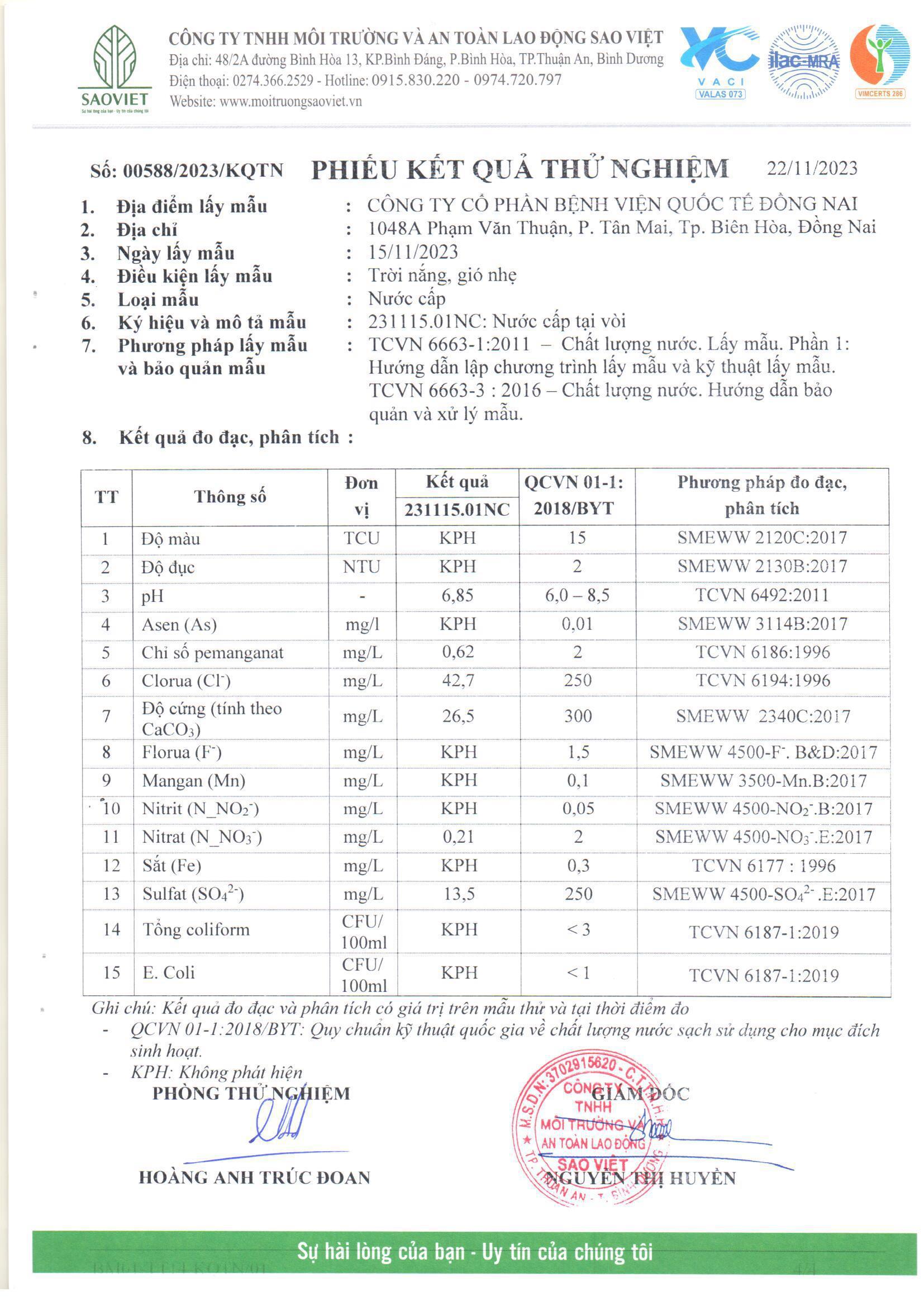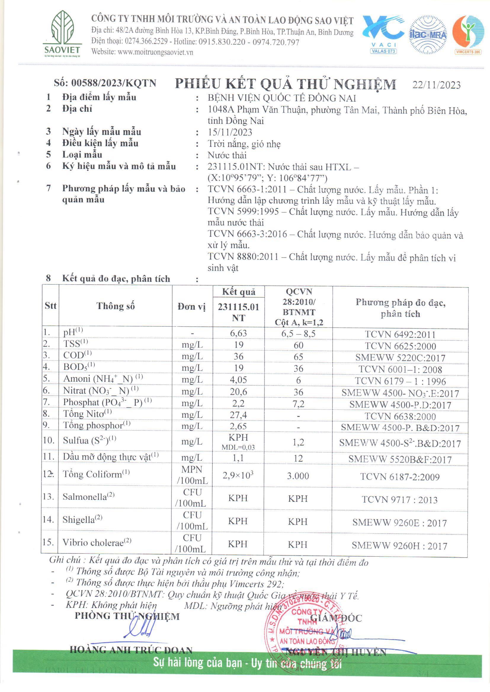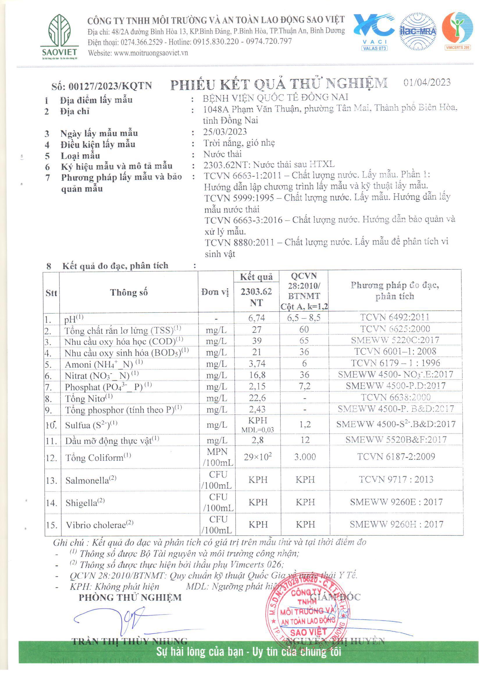 Kết quả quan trắc học 2023 Bệnh viện Hoàn Mỹ Đồng Nai