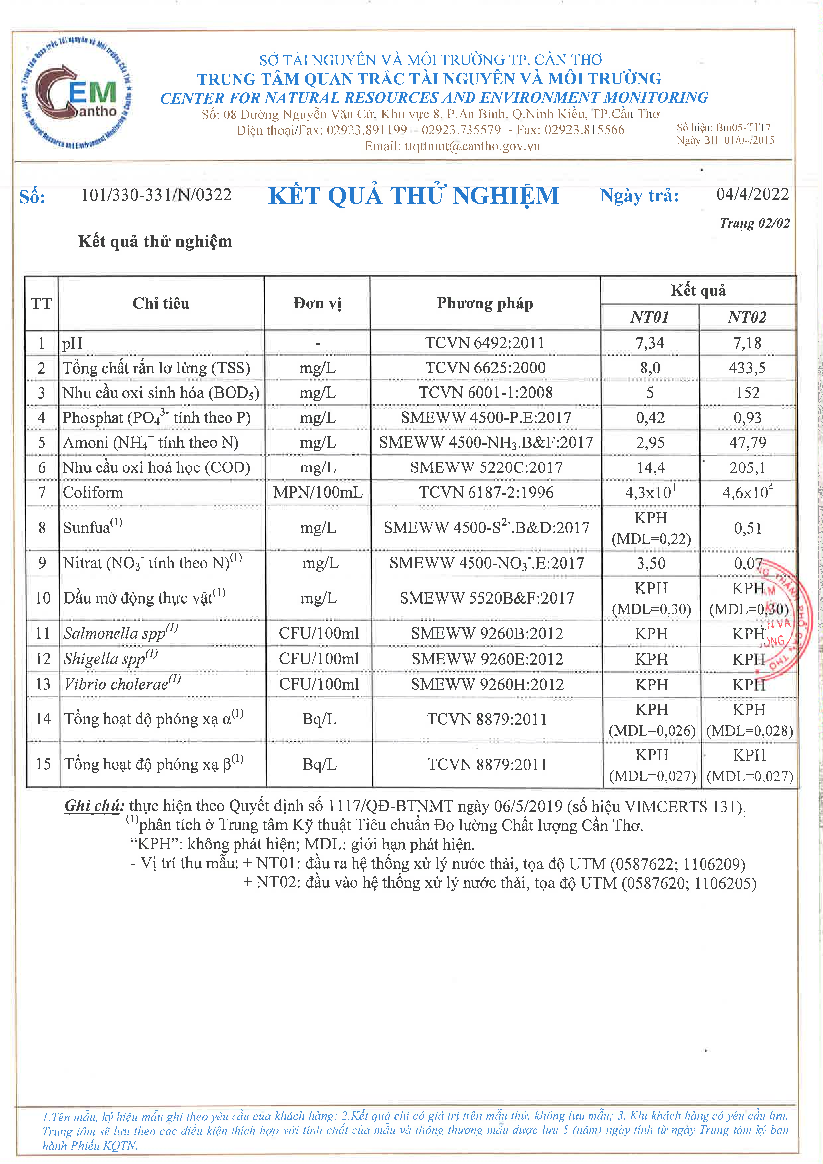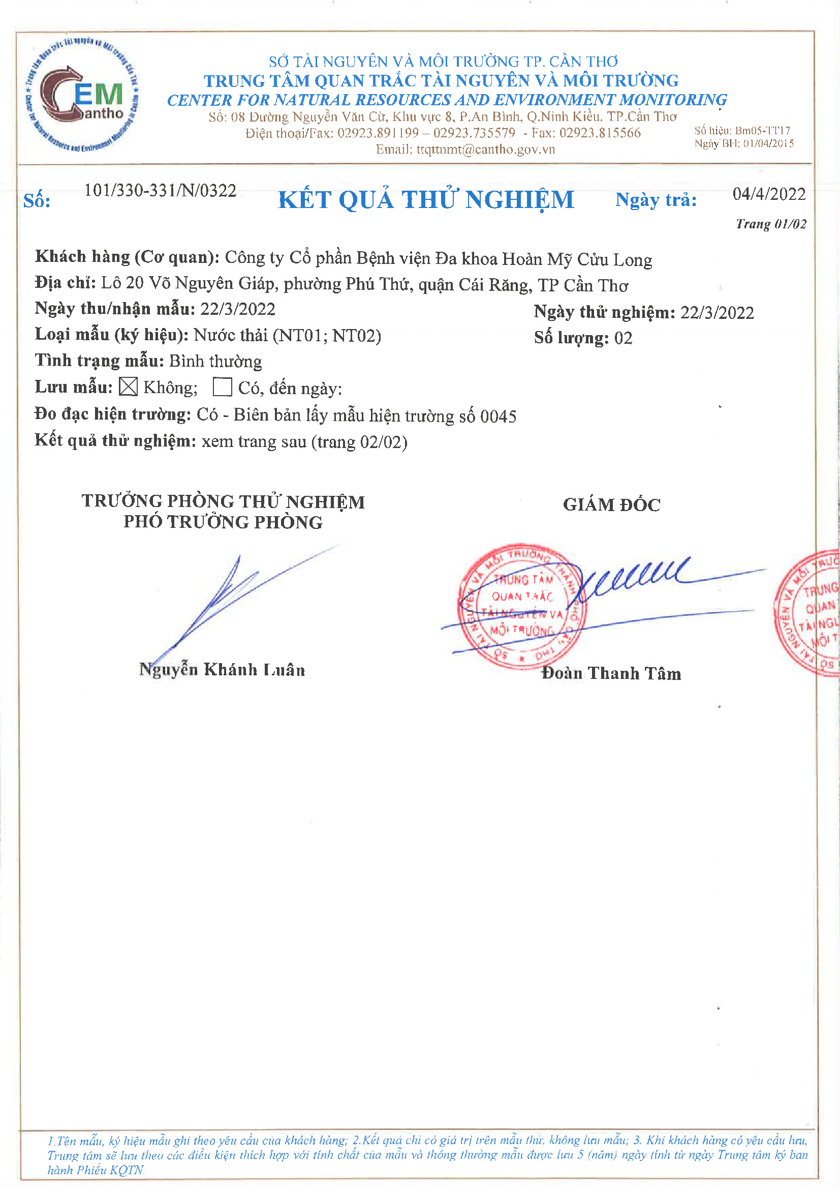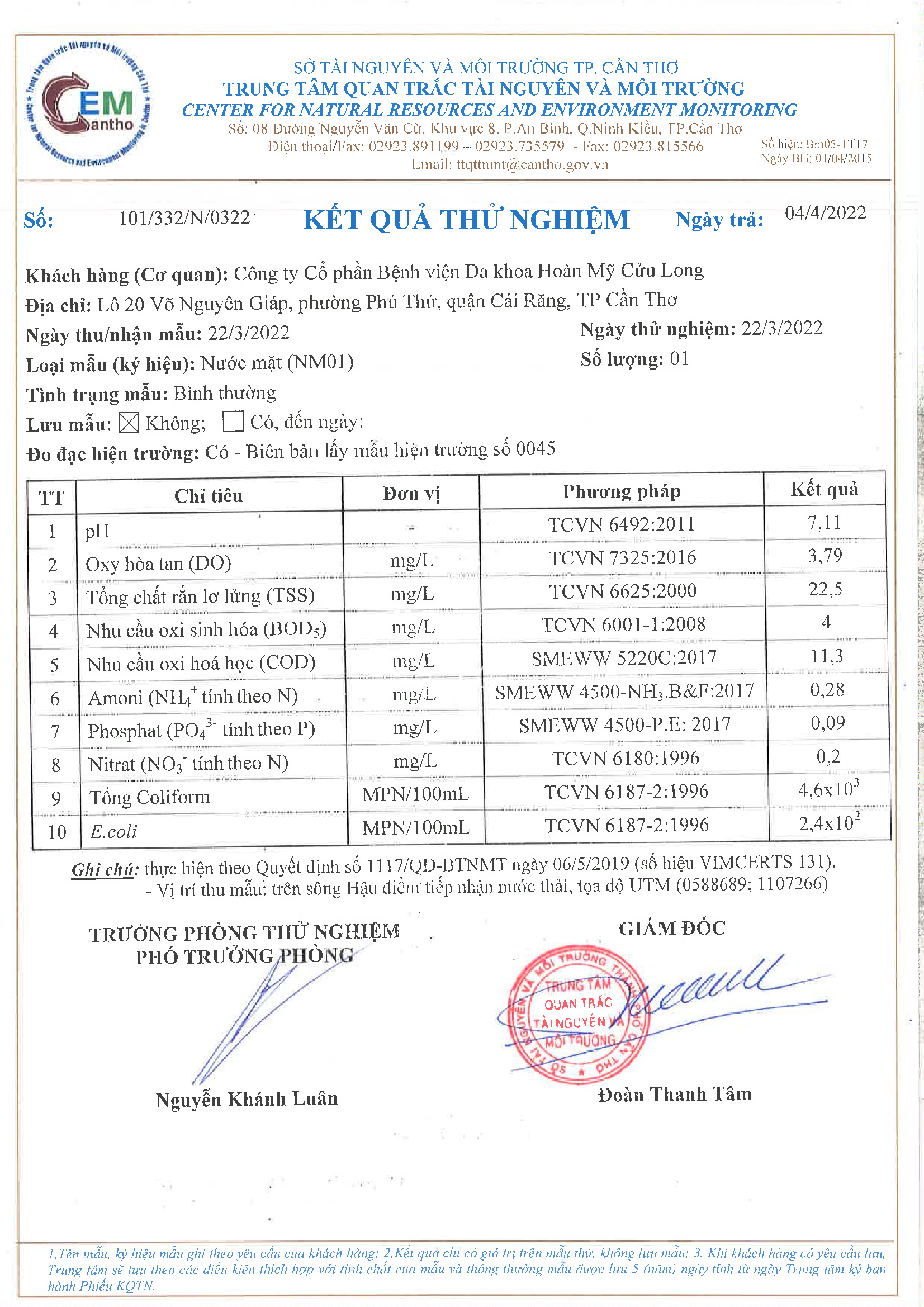 Kết quả quan trắc học quý I – 2022 Bệnh viện Hoàn Mỹ Cửu Long