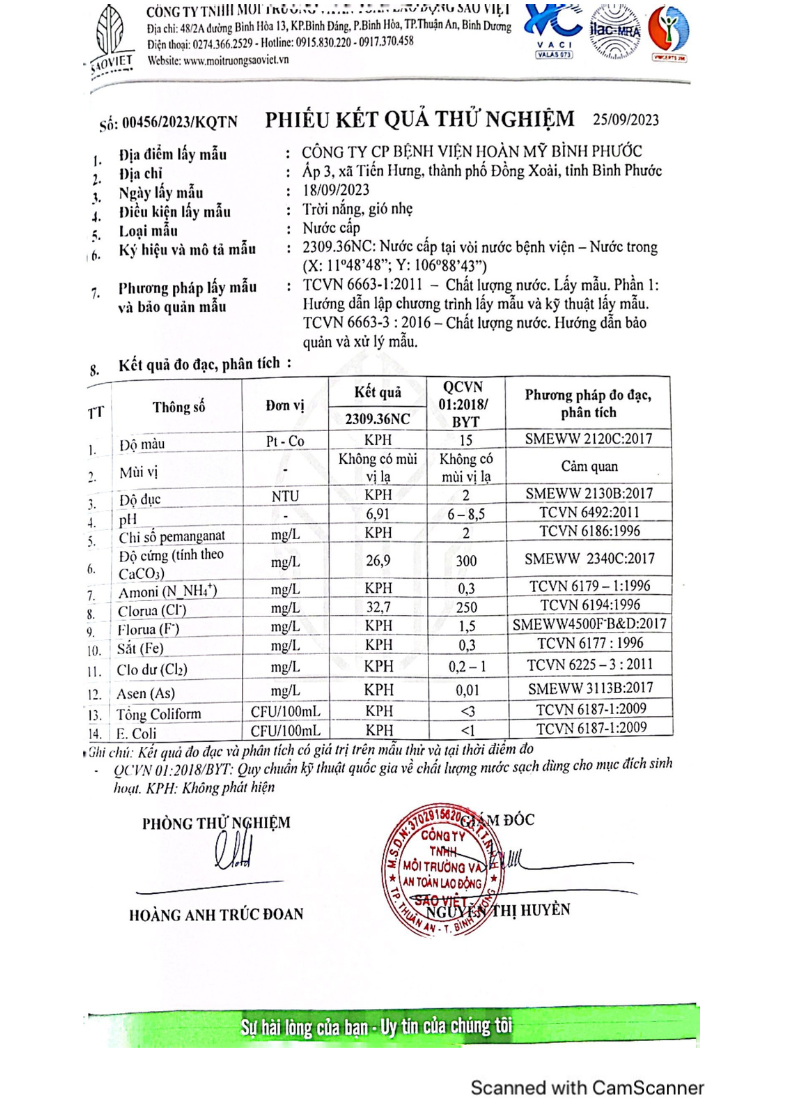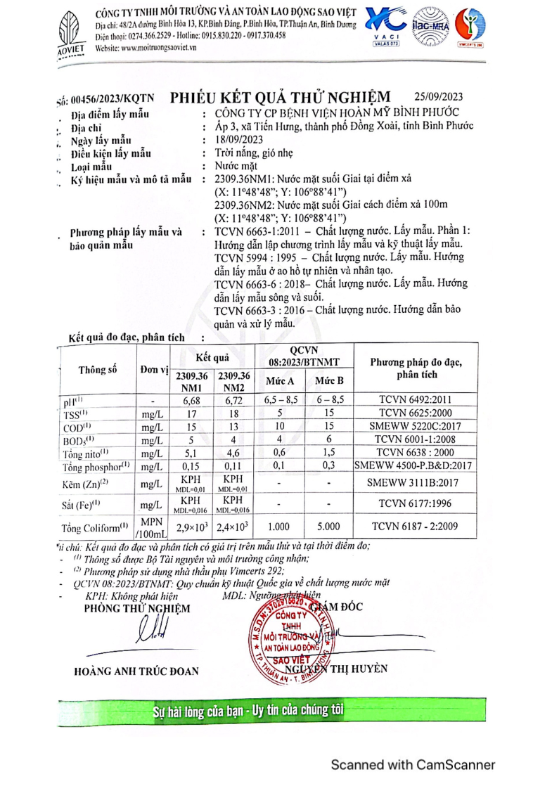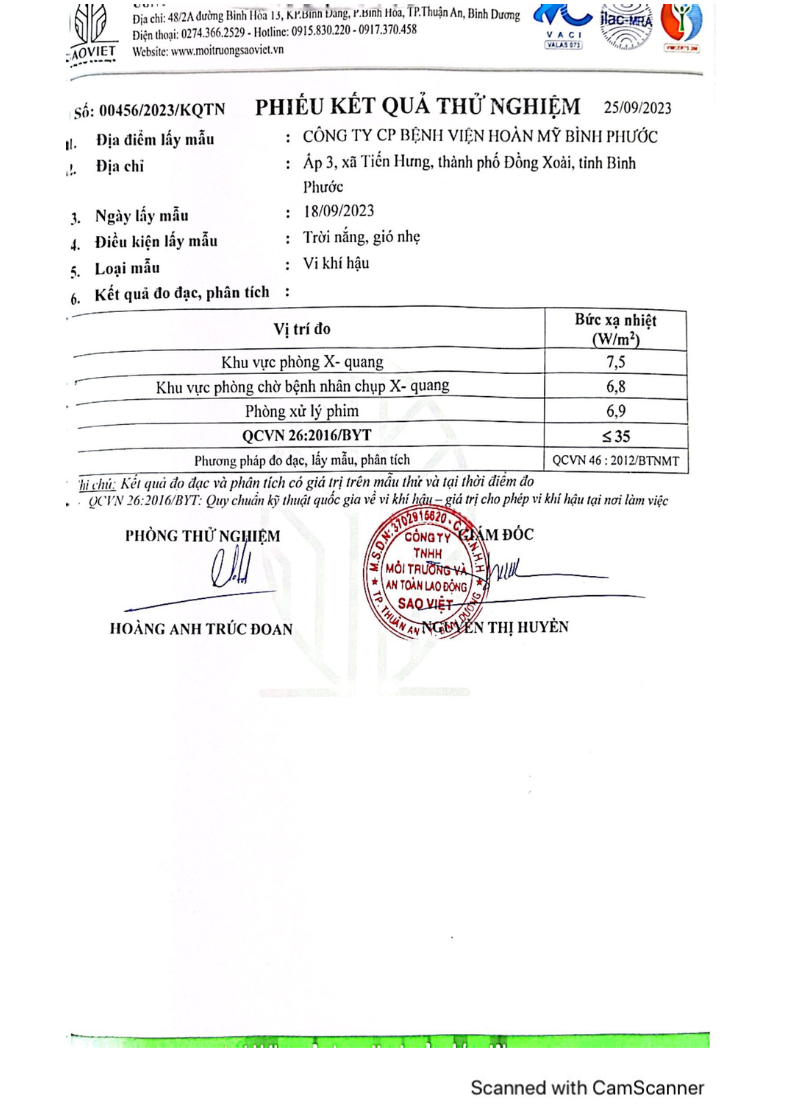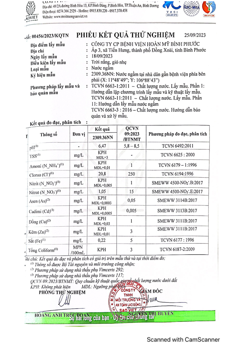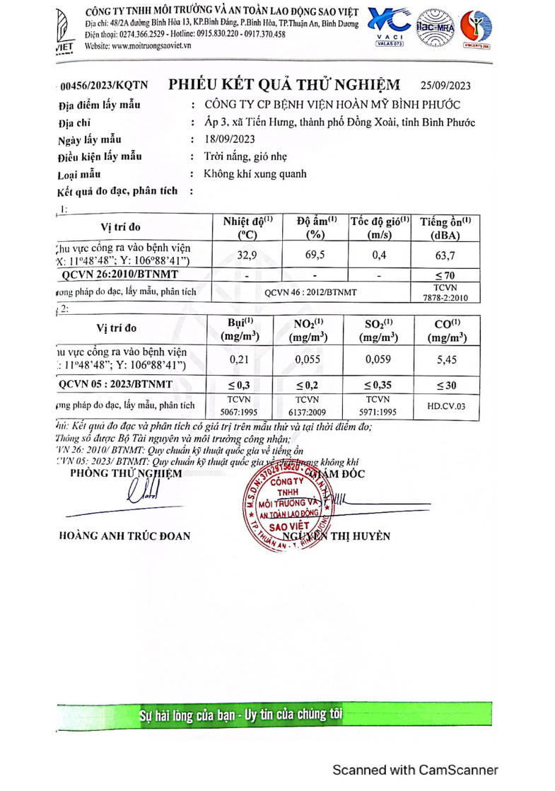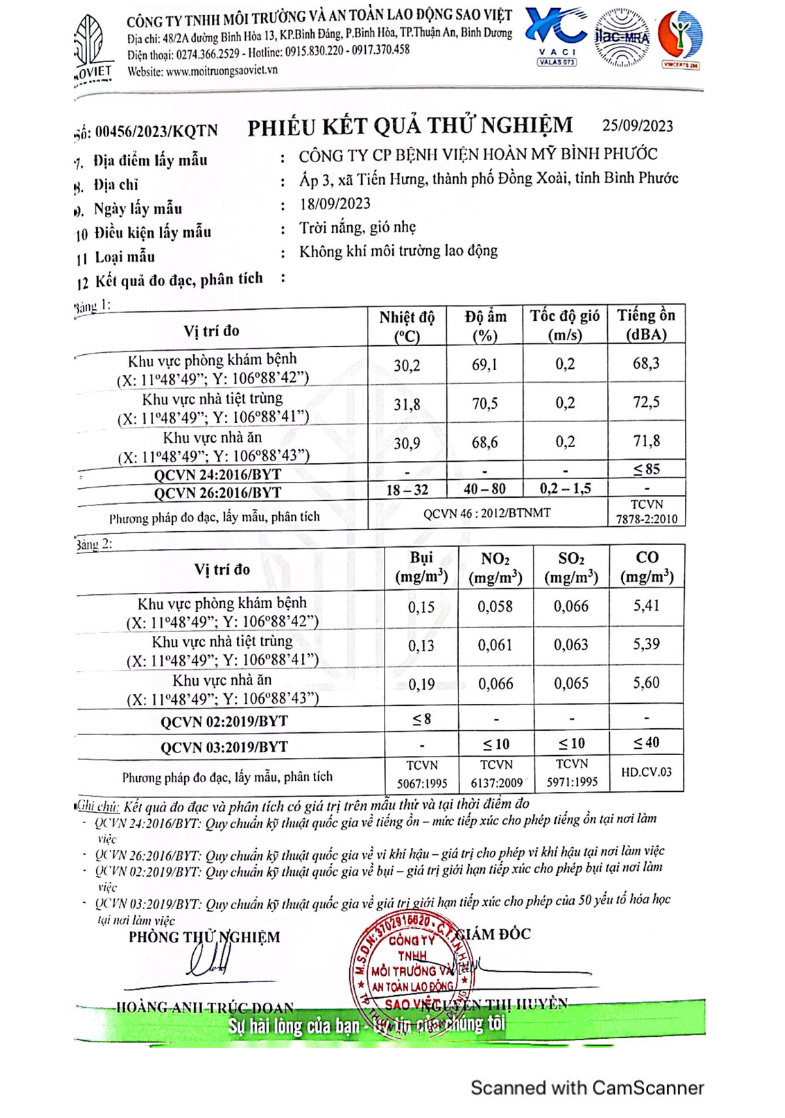 Kết quả quan trắc học quý III – 2023 Bệnh viện Hoàn Mỹ Bình Phước