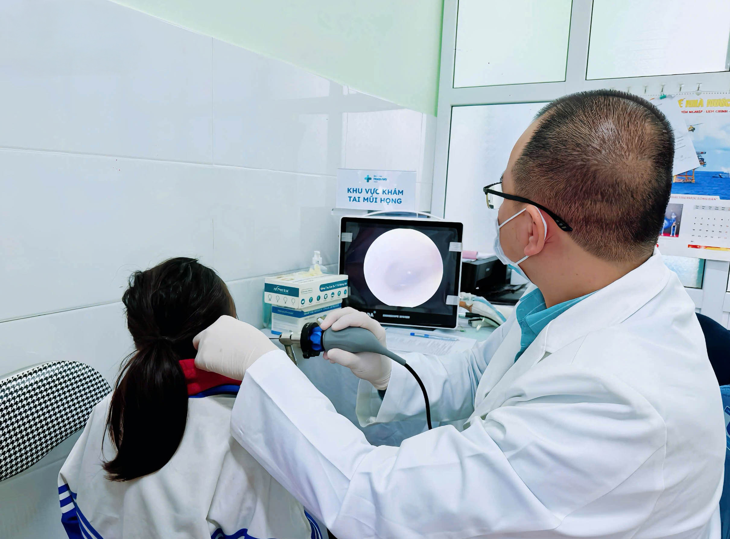 Ảnh: Bác sĩ Bệnh viện Hoàn Mỹ Vinh thực hiện khám Tai Mũi Họng cho người dân địa phương.